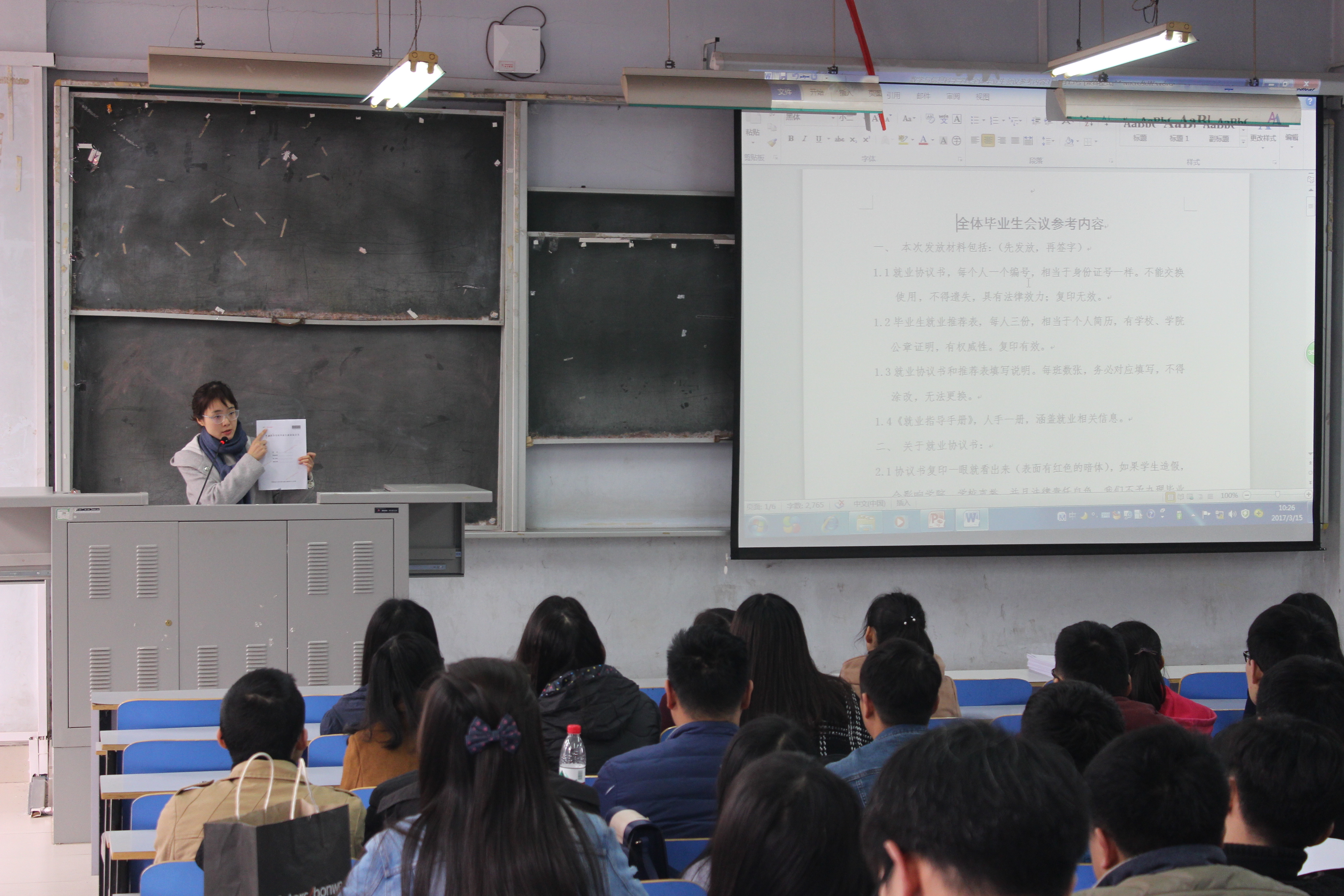 党总支副书记张阳首先对当前的就业形势及就业状况进行了介绍,安排部署了毕业生离校前的相关工作。并鼓励同学们参加各类招聘考试和基层就业项目,努力拓展就业空间;接下来,他从如何调整心态,降低就业期望值;如何主动出击,寻找就业途径;如何做好能力准备、心理准备、材料准备、面试准备;如何增强自我保护意识,注意就业安全等方面做了详细的说明。张书记还提醒毕业生要严格按照时间完成自己的毕业论文设计。
