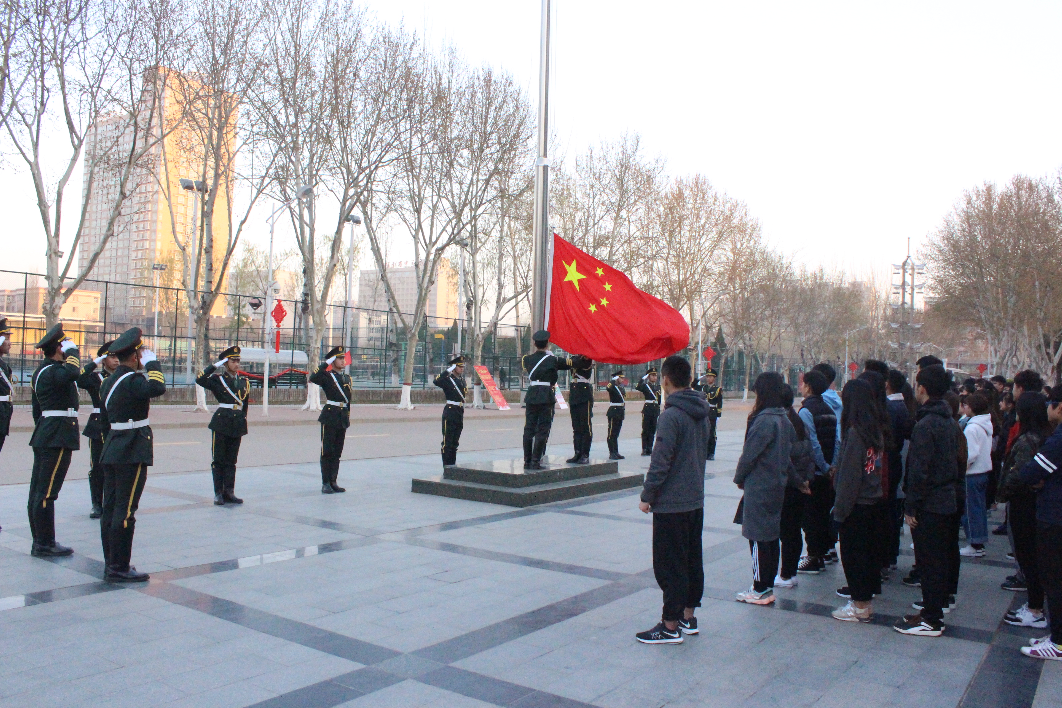 组织学生在东风校区图书馆广场举行了庄严的升国旗仪式。