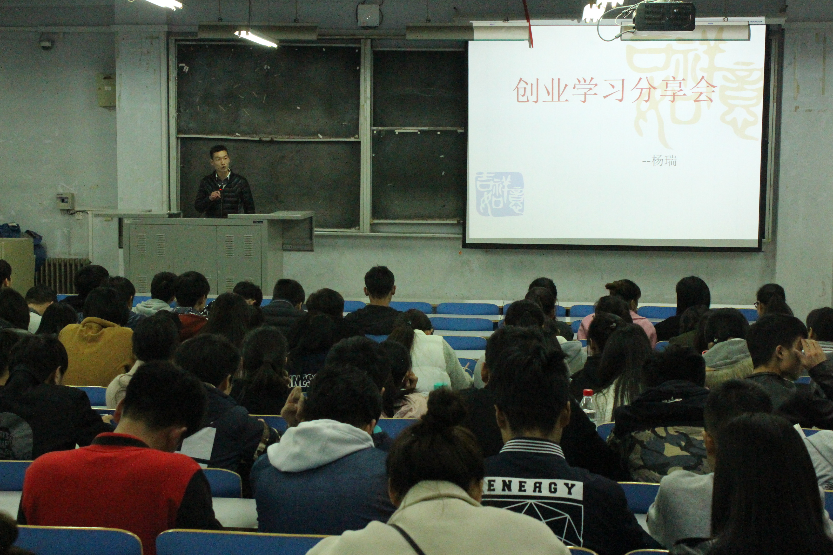讲座伊始,杨瑞学长向我们介绍了我们的专业方向和就业趋势,结合自身经历和见识向我们分析了考研和就业不同道路的前途利弊,更告诫大家要“立长志,不要常立志”,及早确定目标,并长久地坚持自己的梦想,。随后,他又向我们讲了自己的一些创业经历,语言恳切风趣,我们在欢声笑语中收获颇丰。学长还对有创业梦想的学弟学妹们表示了鼓励,不管在精神上还是在经验传授上都予以极大的支持。最后,我院学生会创新创业部的部长李闯同学向大家介绍了最近学校发布的各项创新创业的比赛相关通知,及我院举办首届大学生创新项目大赛的相关事宜,号召大家广泛开拓思路,发挥主动性,积极报名参加比赛活动。