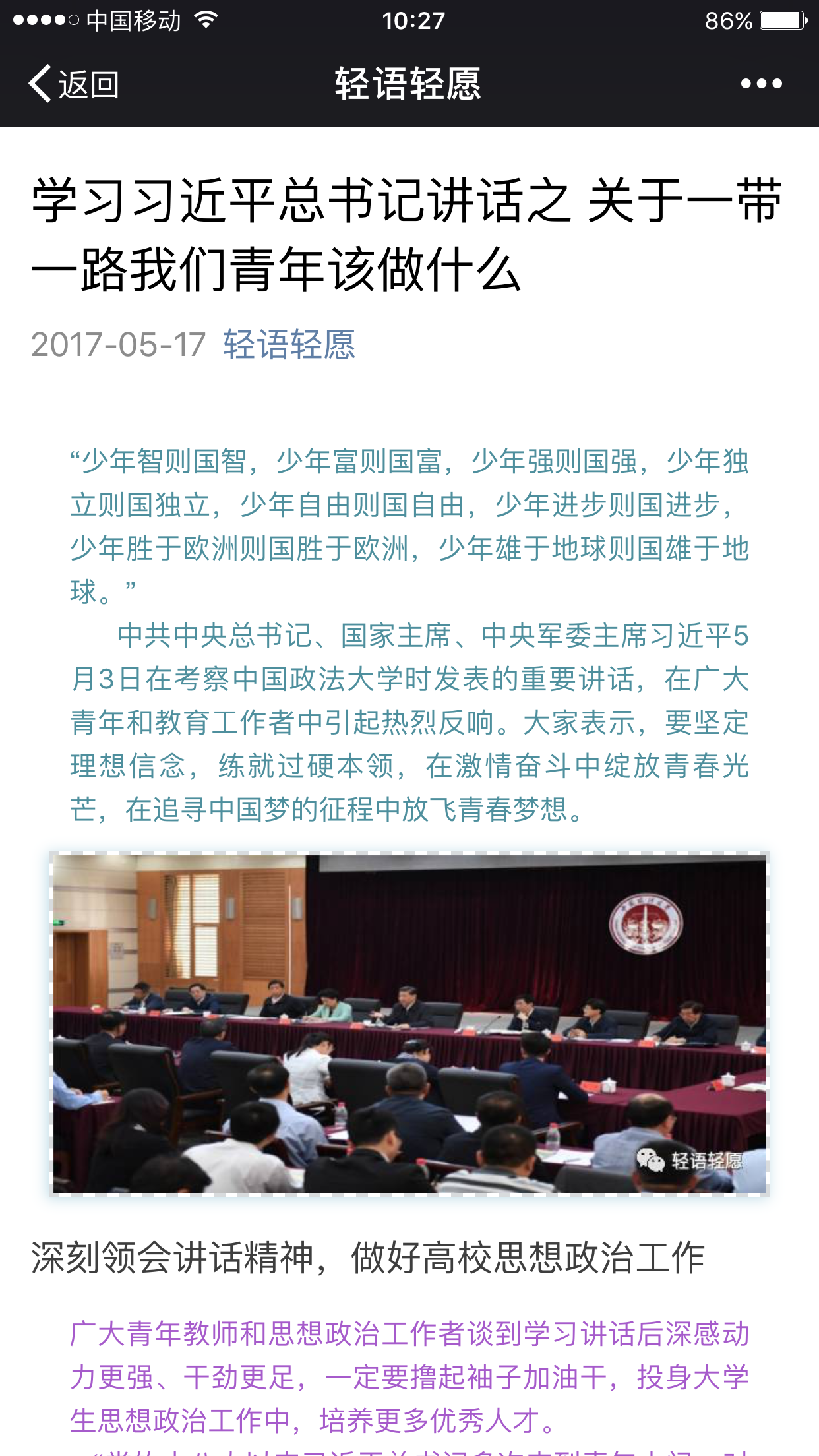 微信公众号轻语轻愿上开展学习活动。第一期推送了“学习习近平总书记讲话,做合格共青团员——‘一带一路’知多少?”,对它的含义、构建、意义等进行了阐述,这不仅是对古丝绸之路的传承和提升,更是对未来子孙后代负责和支持。第二期推送了“学习习近平总书记讲话之关于‘一带一路’我们青年该做什么”,“少年强则国强,少年进步则国进步”,广大青年团员应该坚定理想信念,练就过硬本领,在激情奋斗中绽放青春光芒,在追寻中国梦的征程中放飞青春梦想。