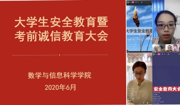 为进一步加强学生安全教育,着力防范安全隐患,提高学生自我保护能力和安全意识,同时加强学风建设,严肃考风考纪,促进优良学风的形成,直播吧 于6月8日-6月12日分别召开线上安全教育暨考前诚信教育主题班会。