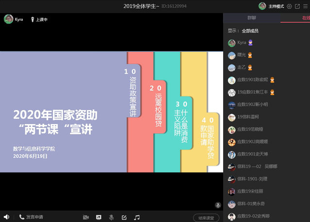 于2020年6月19日上午组织召开资助“两节课”线上宣讲会,负责资助工作的韩笑老师和2019级全体学生参加了此次会议。