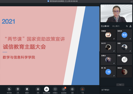为全面宣传党和国家的学生资助政策,充分发挥资助育人功能,增强当代大学生的诚信意识和责任意识,9月10日直播吧 在线上钉钉平台召开资助知识宣讲“两节课”活动,负责资助工作的专职教师韩笑及全体2021级新生参加会议。