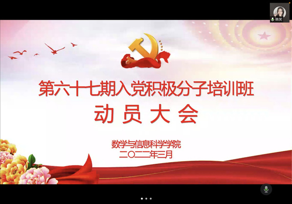 为严格党员发展流程,进一步贯彻落实从严治党的要求,端正入党积极分子的入党动机,提高入党积极分子的党性修养,直播吧 学生党支部于3月28日晚召开第67期入党积极分子培训班动员大会线上视频会议,会议由支部组织委员周四晴主持,支部书记韩笑、学生支部党员代表以及67期入党积极分子培训班全体学员参加了会议。