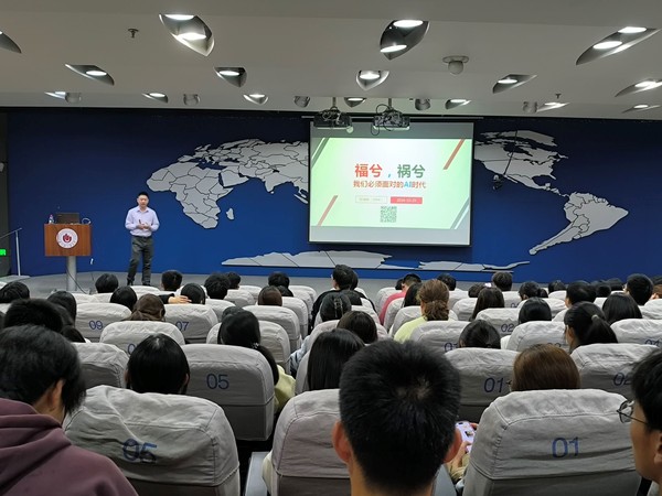 讲堂上,曾浩晔以“福兮,祸兮——我们必须面对的AI时代”为主题,围绕AI时代背景与趋势、AI对各行各业影响分析、人工智能在日常生活中的应用、人工智能带来的社会问题和挑战、应对策略与建议,结合自身工作经验,为同学们讲授AI时代的机遇和挑战,结合数学专业特点和发展风向,为同学们在学业规划和职业规划做出建议和指导。交流环节上,同学们对 “数学专业如何在AI行业领域”“本科所学习的专业知识与当前AI行业发展脱节”等问题进行讨论,曾老师都给予耐心解答,并给出合理建议。
