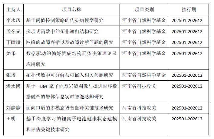 近日,河南省科技厅公布了2025年度河南省自然科学基金项目和河南省科技攻关项目立项名单,直播吧 科研工作捷报频传,在去年获批2项国家自然科学基金项目和2项河南省教育厅高等学校重点科研项目的基础上,今年又获批5项河南省自然科学基金项目和3项河南省科技攻关项目。这一成绩的取得,是直播吧 科研工作持续发力的又一成果,标志着直播吧 科研实力和创新能力迈上了新台阶。直播吧 将以此为契机,进一步加强科研团队建设,优化学科布局,提升科研水平,推动直播吧 高质量发展。