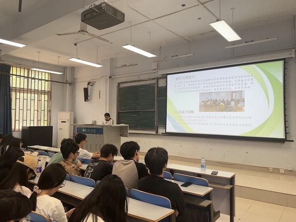 会上,王纯老师重申四级网格长的工作职责,强调四级网格长之于心理健康工作的重要作用;围绕躁郁症、抑郁症等一系列心理疾病,从病理表现、识别技巧、自救方式、朋辈帮扶技巧等方面对参会学生进行知识科普及理论培训;以模拟案例提升参会学生对心理异常状态的觉察敏感度,要求参会学生及时上报特殊情况。校蒲公英使者孙杜鑫分享了自己在参加校级心理健康培训的心得体会,列举了人际交流、情绪管理、烦恼纾解等可采取的团体辅导形式,并带领全体参会同学于东风校区操场进行团体辅导活动,在活动中进一步提高我院朋辈心理帮扶工作技巧。最后,王老师对本月心理情景剧大赛、“二级蒲公英使者”培训、心理嘉年华、蒲公英项目申报、“5·25”心理健康教育宣传月等系列活动进行了部署。