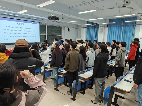 会议伊始,王老师对学生进行了诚信教育,告知了借款学生还款方式,并强调了违约的后果,提醒学生定期登录系统,及时更新个人信息,做到诚信贷款,按时还款。王老师强调,助学贷款诚信还款不仅是法律义务,也是个人信誉和社会责任感的体现。诚信申请、合理使用助学贷款,不仅是对自身责任的履行,也是对社会资源的尊重和珍惜。希望每位有需要的学生都能在资助政策的帮助下,得到更好的学习机会,实现个人梦想。并指导大家签订《国家开发银行股份有限公司高校助学贷款借款合同》《国家开发银行高校助学贷款约定与承诺书》与《高校助学贷款申请表》。最后,王老师带领全体申请贷款同学诚信宣誓。
